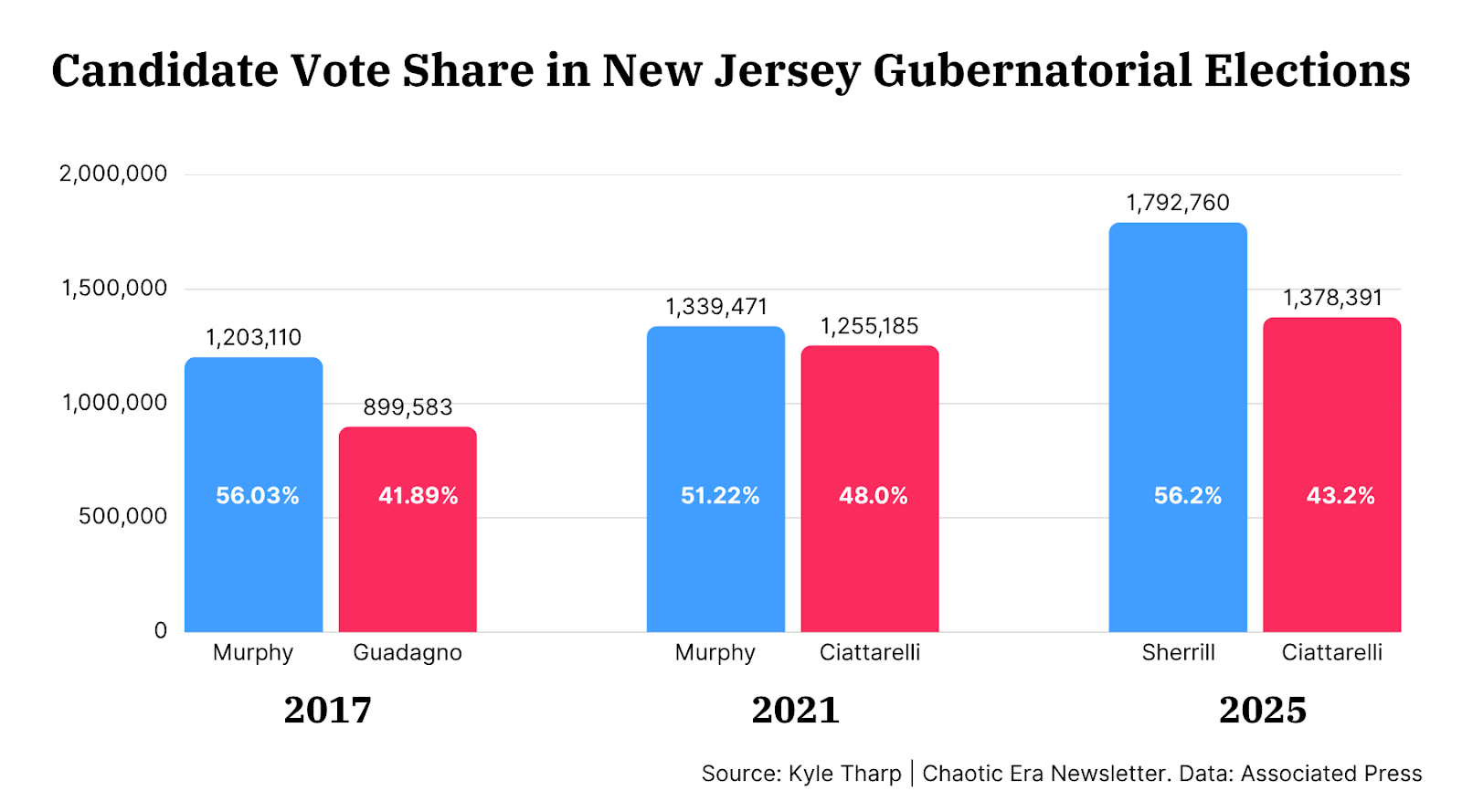 Further north in New Jersey, few were predicting Democrats would have such a good night. There, Congresswoman Mikie Sherrill (a candidate I called a milquetoast moderate last month) garnered nearly 1.5 million votes, about 600,000 more than Democratic Governor Phil Murphy’s 2017 total vote count. By the end of the night, Sherrill had secured a commanding 56.3% of the vote versus 43.1% for her MAGA opponent, Republican Jack Ciattarelli, maintaining a double-digit margin close to Murphy’s. Her win marks the first time in 50 years that New Jersey Democrats have won three consecutive gubernatorial terms - a historic milestone underscoring the importance of what happened this week.