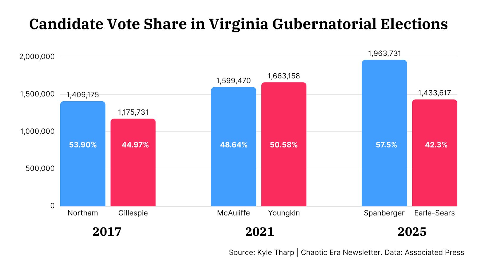 Just look at Virginia, where Democrat Abigail Spanberger claimed the governorship with nearly 1.96 million votes, about 600,000 more than her party’s 2017 nominee, Ralph Northam, received in his blowout victory over Republican Ed Gillespie. With votes almost all tallied, Spanberger defeated her opponent, Republican Winsome Earle-Sears, by nearly 16 points - almost double Northam’s margin 2017 - and received more votes than any Virginia governor in history. The centrist former Congresswoman dramatically improved Democrats' performance across the Commonwealth, especially in suburban areas, securing 64% of the vote in bellwether Loudoun County alone, nearly doubling Kamala Harris’s margin of victory there in 2024 and landing 9 points ahead of Northam’s 2017 margin.
