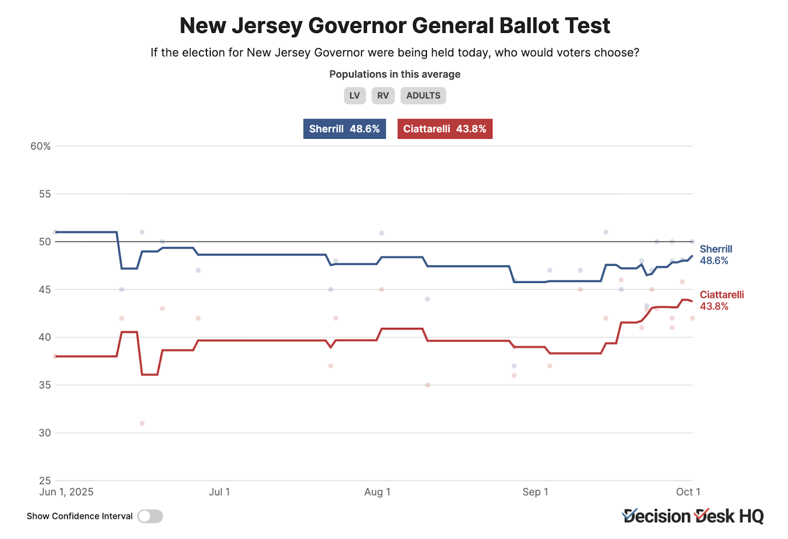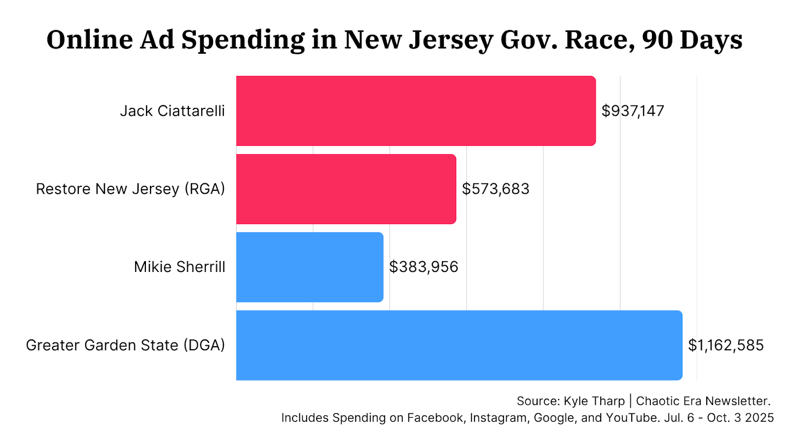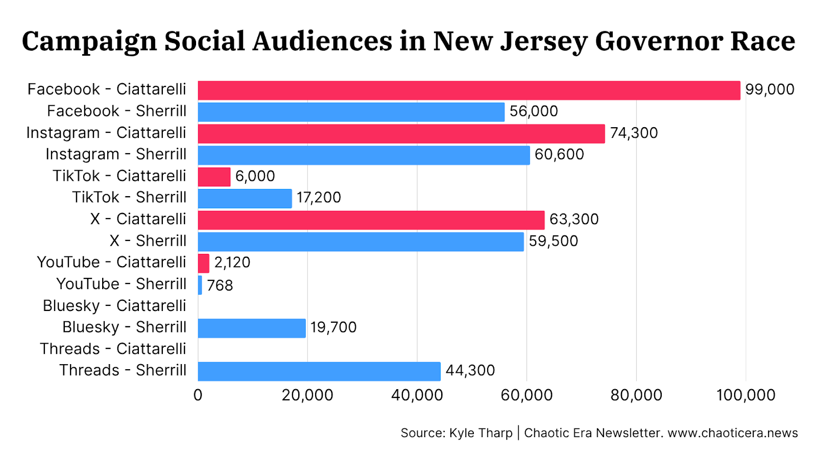 Online, Ciattarelli has amassed a social media following just as large as Sherrill's across platforms, and his campaign has outspent hers on digital advertising. Polling still shows Sherrill ahead, though the race has tightened as expected; the latest Decision Desk HQ average has her up roughly five points.