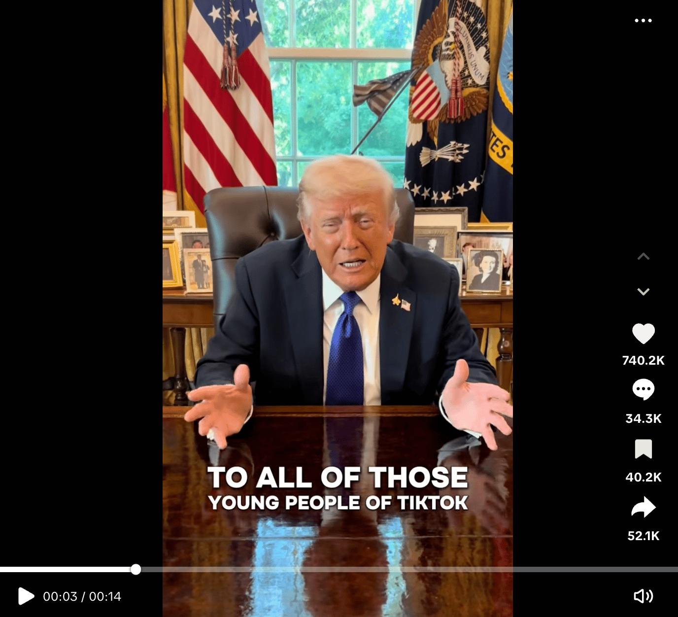 Yesterday, Donald Trump posted on his TikTok account for the first time since last year, in a direct-to-camera video telling the platform’s users, “I saved TikTok, so you owe me big.” Watch the video below:
