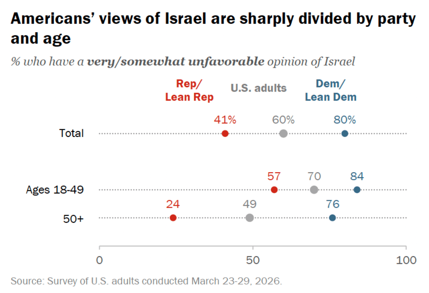 Among both Republicans and Democrats, a majority of people under the age of 50 have an unfavorable opinion of the state of Israel. The country’s shift on Israel is so dramatic that even a major liberal pro-Israel group, J Street, now supports blocking all military aid to the country.