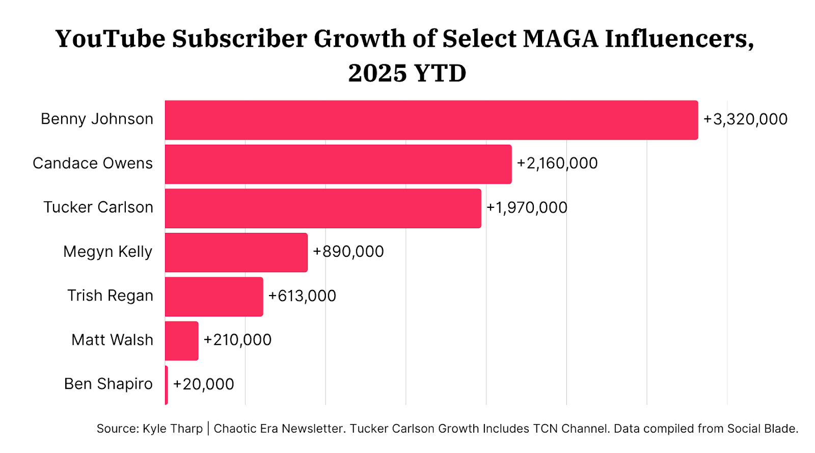 The conservative fight over supporting Israel has been simmering all year, with top influencers like Carlson, Candace Owens, and Steve Bannon bucking Republican orthodoxy on the issue. The shift reflects both declining support for Israel among younger MAGA supporters and a shift in audience demand in online MAGA media. The data shows that Carlson and Owens, in particular, are winning - having grown their following and clout significantly this year, while pro-Israel voices like Shapiro have seen their audience growth stall in 2025.